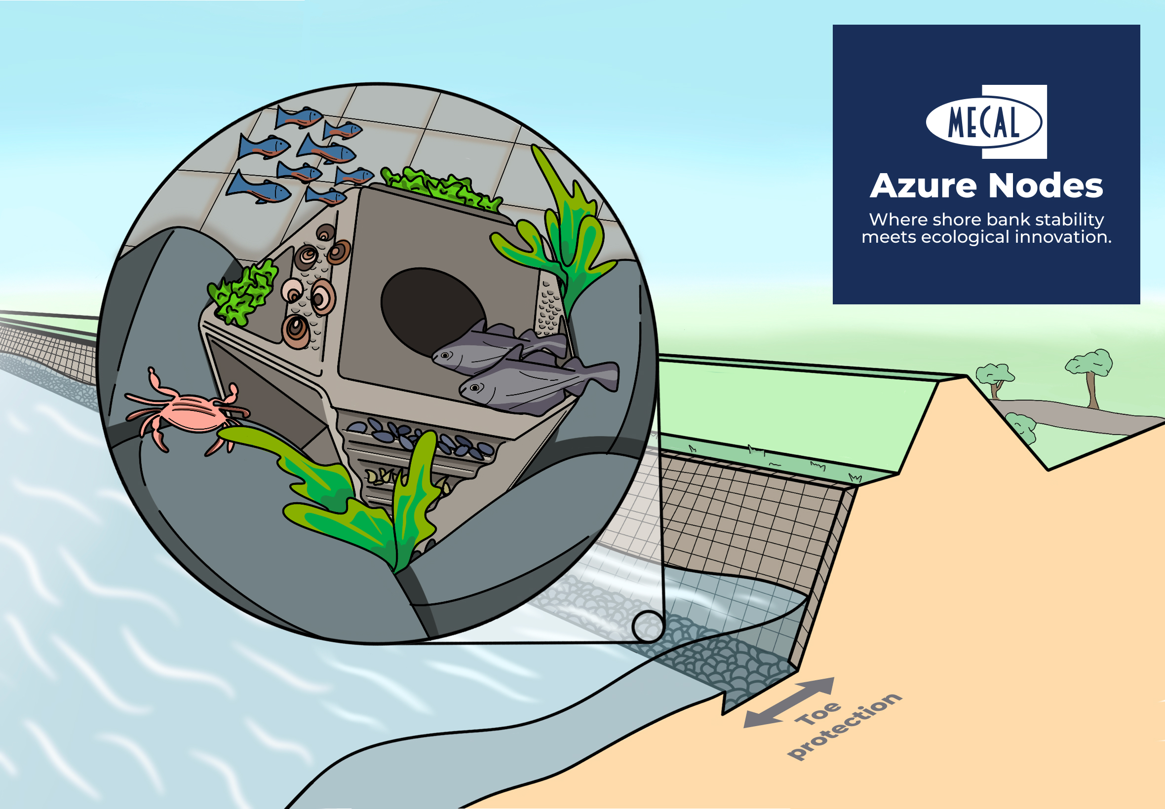 Azure Nodes strengthen bank protection while simultaneously enhancing biodiversity. They can be incorporated into the toe construction of shoreline protection systems alongside armour rock. Their integration is fully customizable, with a flexible ratio of armour rock to Azure Nodes to suit specific project requirements, and module weights adjustable to match local storm conditions… Learn more.